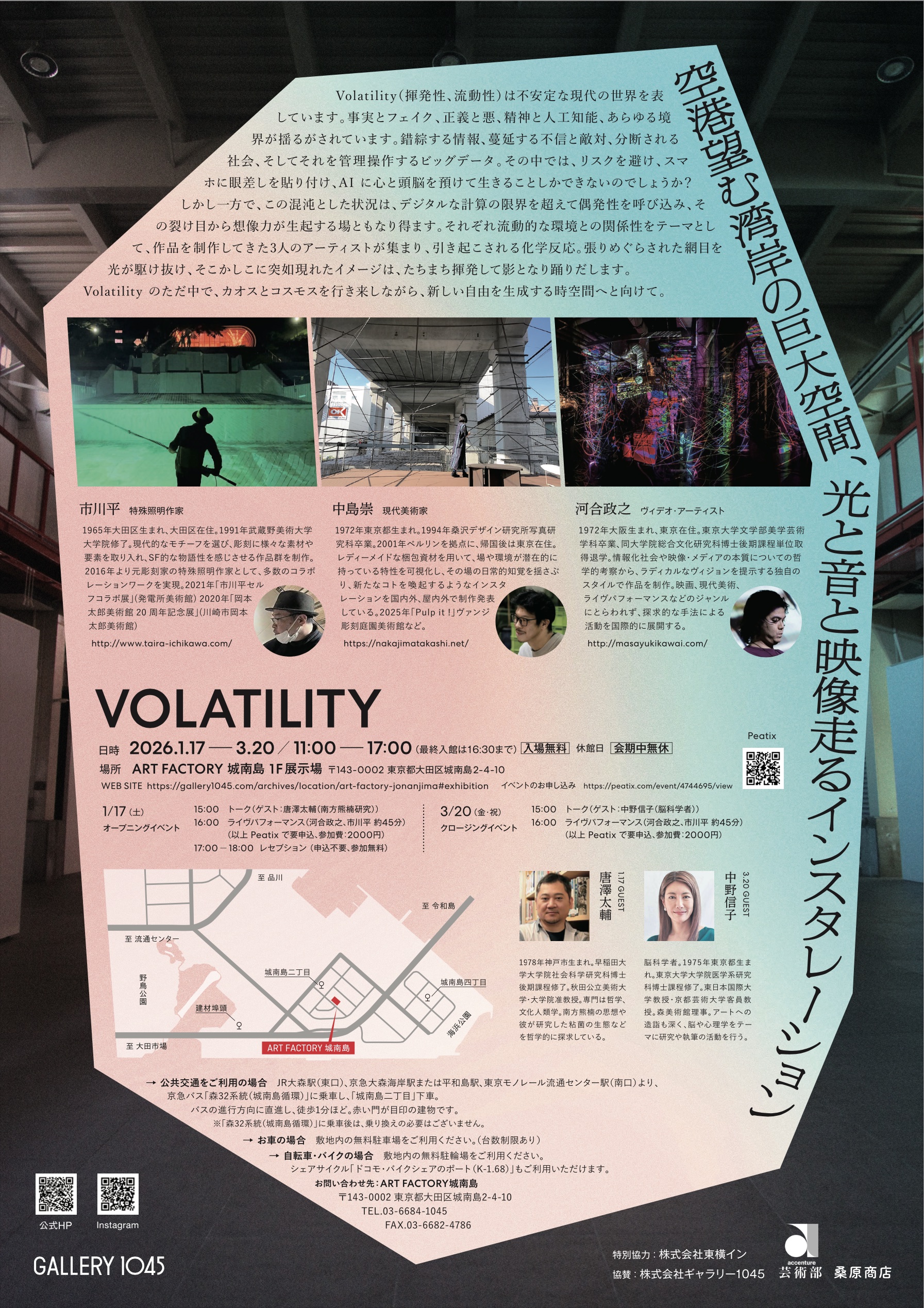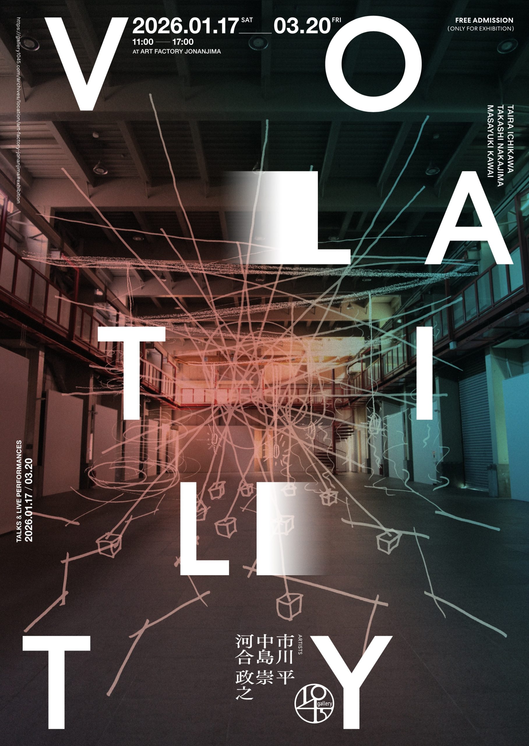 2026年1月17日(土)~3月20日(金・祝)、特殊照明作家・市川平、現代芸術家・中島崇、ヴィデオアーティスト・河合政之の3名が「Volatility(揮発性、流動性)」をテーマに、光・音・映像を用いた巨大空間でのインスタレーション展を開催。 ゲストを交えたトークや市川・河合によるライヴパフォーマンスも行います。